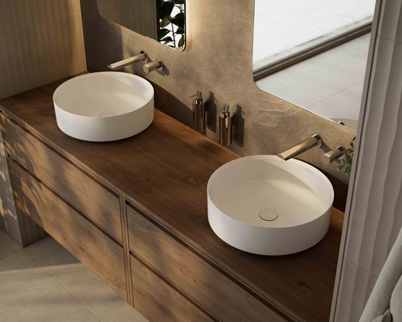 Das Kerid 43 Aufsatzwaschbecken ist ein perfekt rundes Waschbecken, das auf einer Arbeitsplatte oder einem Unterschrank installiert wird. Es teilt seine Design-DNA mit der Kerid-Badewanne, mit einem geformten Rand und einem exakt ausgekehlten Boden, der ihm einen „schwebenden Effekt“ verleiht. Mit einem Durchmesser von 425 mm eignet es sich für viele Badezimmer und Gäste-Wc‘s und passt auch gut zu den Badewannen Taizu, Vetralla und ios von Victoria + Albert. Es ist in Standard Glanz oder alternativ mit luxuriöser Standard Matt Oberfläche erhältlich. Das Becken kann in einer Auswahl von über 200 Farben aus der RAL-Farbpalette bestellt werden.