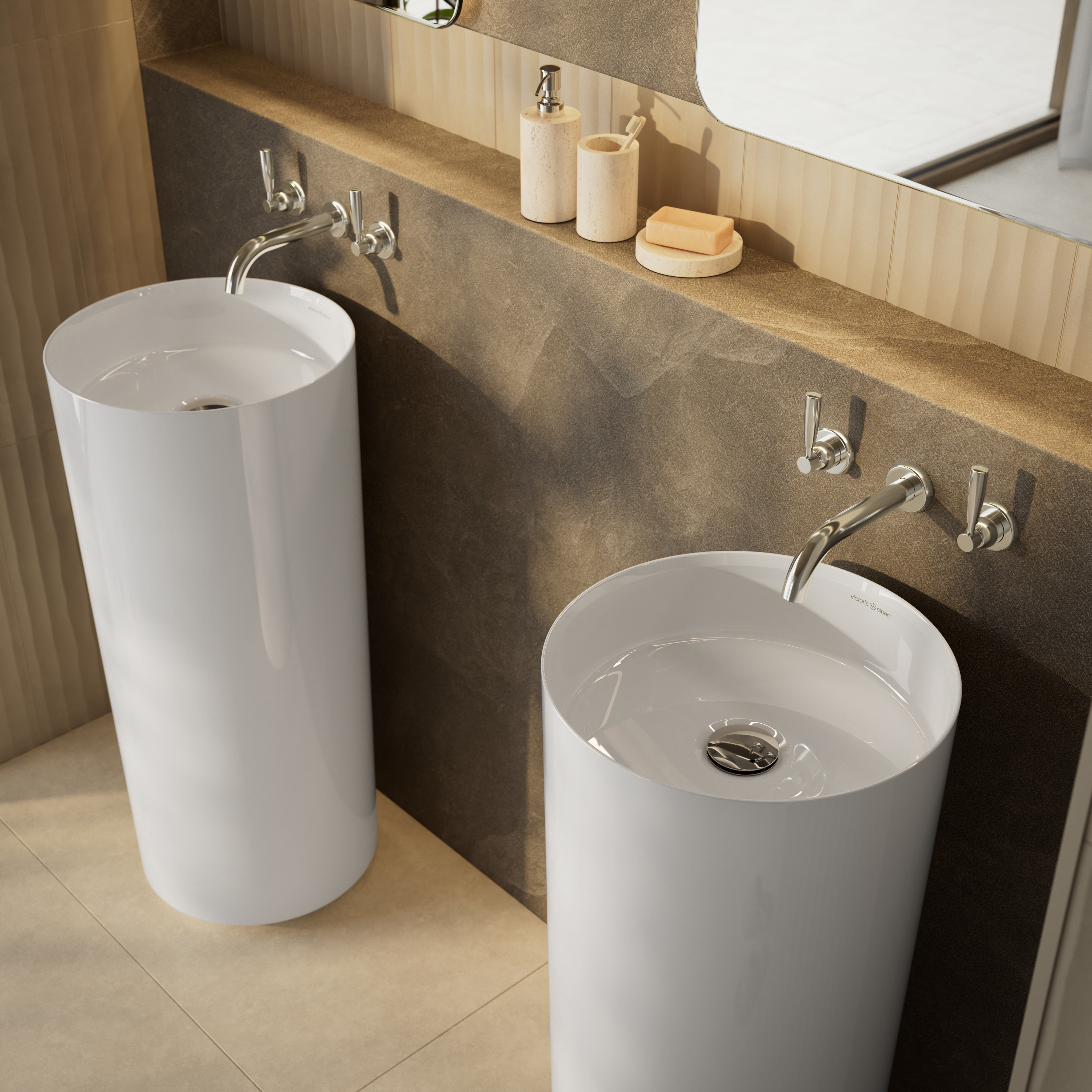 The Kerid 40 podium basin brings the Kerid collection’s signature aesthetic into a compact, floorstanding form suited to contemporary indoor or outdoor bathrooms. Its seamless one‑piece body features chamfered detailing at the base, creating a subtle floating effect, while the thin, elegant rim reinforces the collection’s calm, spa‑inspired design.