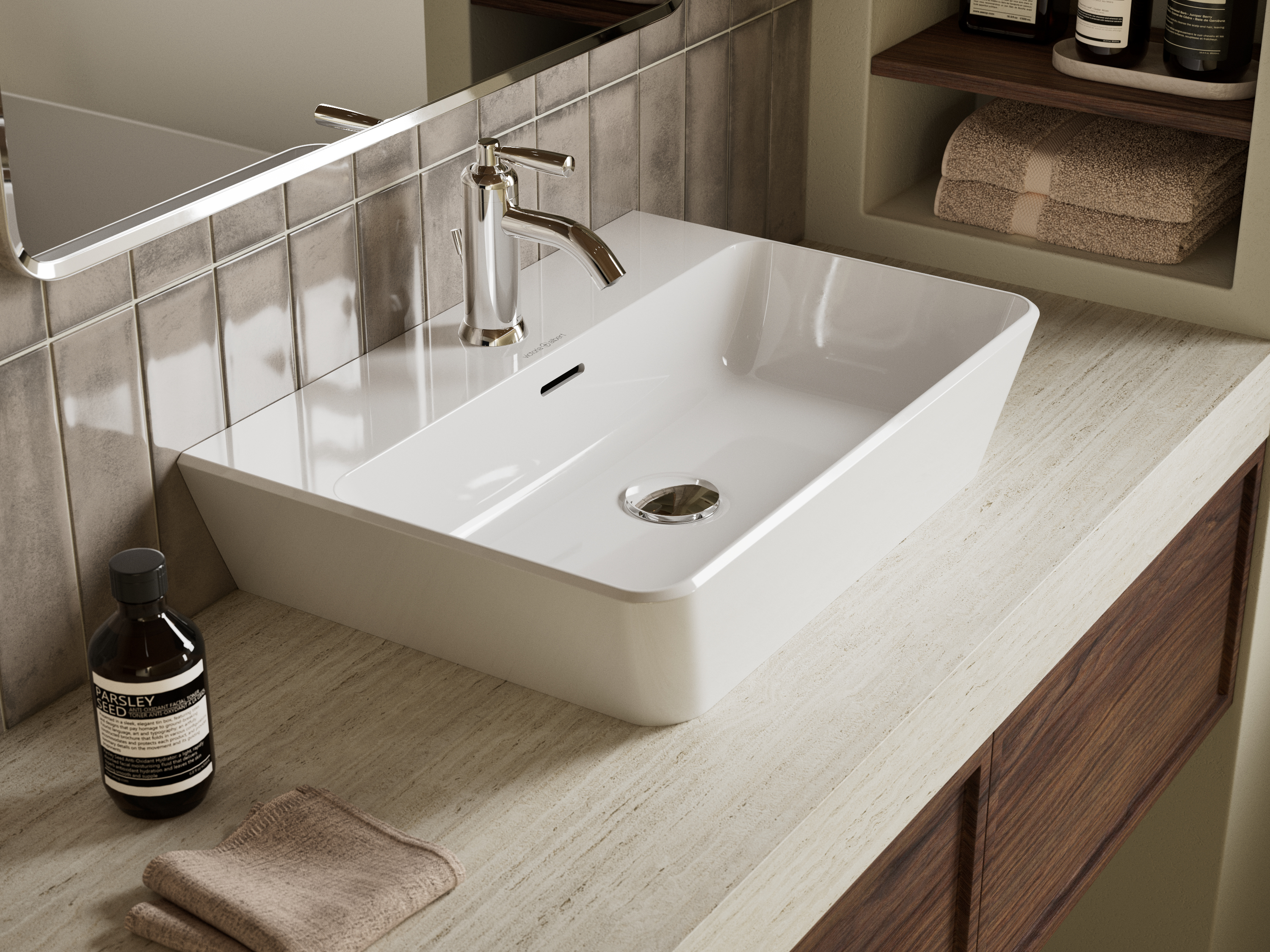 The Vetralla 60 back‑to‑wall basin, echoes the same square‑angled profiling as the Vetralla baths, creating a cohesive design language across the range.