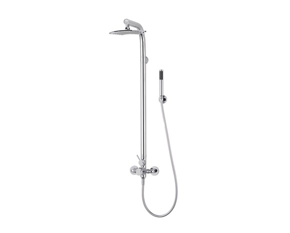Colonne de douche thermostatique murale avec ensemble de douche. Dispose d’une pomme de douche de 20cm de diamètre avec picots doux pour un nettoyage facile.